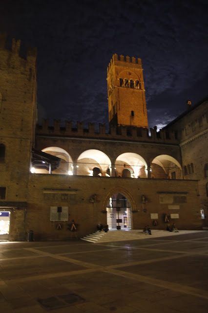 Bologna’da dolaşırken hava kararıyor, Bologna’nın bir de akşamını görüyoruz, ışıklı gece manzarası insanı büyülüyor.
